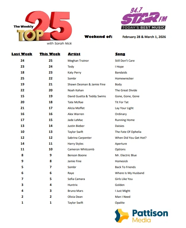 Weekly Top 25 Countdown Chart – February 28 & March 1, 2026